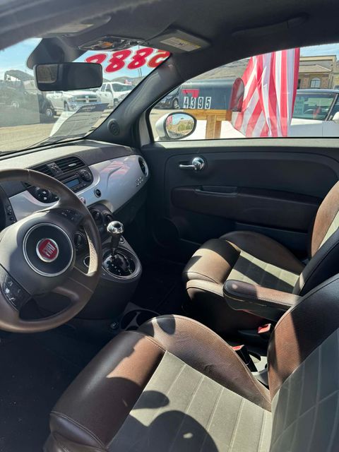 This 2013 Fiat 500 is equipped with the following options: Quick Order Package 22D, #2 Seat Foam Cushion, 16'' x 6.5'' Aluminum Wheels, 4-Wheel Disc Brakes, 7 Speakers, ABS brakes, Air Conditioning, Alloy wheels, AMFM Radio, AMFM radio, Anti-whiplash front head restraints, Brake assist, Bumpers: body-color, CD player, Delay-off headlights, Driver door bin, Driver vanity mirror, Dual front impact airbags, Dual front side impact airbags, Electronic Stability Control, Front anti-roll bar, Front Bucket Seats, Front fog lights, Front reading lights, Front wheel independent suspension, Heated door mirrors, Illuminated entry, Knee airbag, Leather steering wheel, Low tire pressure warning, MarroneGrigio (BrownGray) Seats, Occupant sensing airbag, Outside temperature display, Overhead airbag, Passenger door bin, Passenger vanity mirror, Power door mirrors, Power steering, Power windows, Radio data system, Rear window defroster, Rear window wiper, Remote keyless entry, Security system, Speed control, Split folding rear seat, Spoiler, Sport Cloth Bucket Seats, Sport steering wheel, Steering wheel mounted audio controls, Tachometer, Tilt steering wheel, Traction control, and Trip computer.