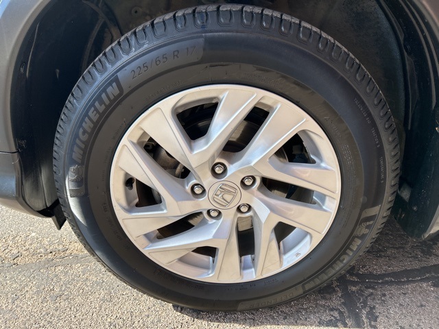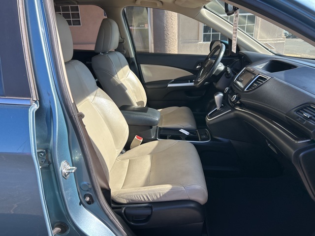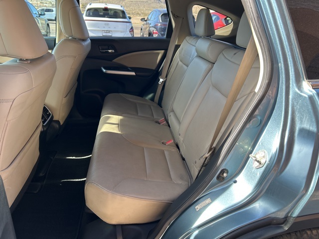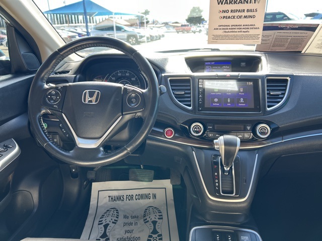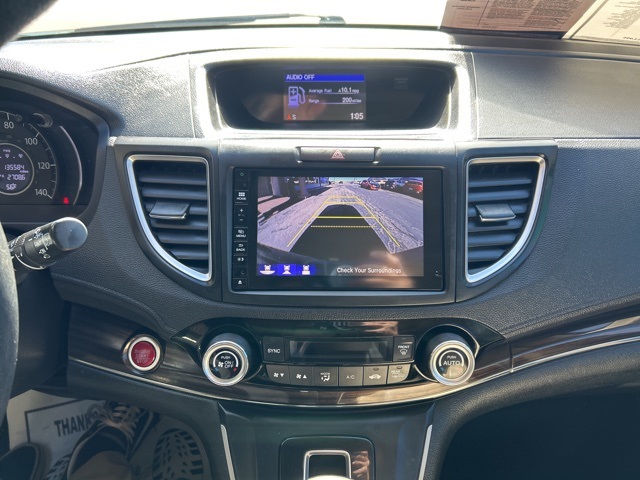 This 2015 Honda CR-V is equipped with the following options: 17'' Alloy Wheels, 4-Wheel Disc Brakes, 5.048 Axle Ratio, 7 Speakers, ABS brakes, Air Conditioning, Alloy wheels, AMFM radio: SiriusXM, Auto-dimming Rear-View mirror, Automatic temperature control, Brake assist, Bumpers: body-color, CD player, Compass, Delay-off headlights, Driver door bin, Driver vanity mirror, Dual front impact airbags, Dual front side impact airbags, Electronic Stability Control, Exterior Parking Camera Rear, Four wheel independent suspension, Front anti-roll bar, Front Bucket Seats, Front Center Armrest, Front dual zone AC, Front fog lights, Front reading lights, Heated door mirrors, Heated Front Bucket Seats, Heated front seats, Illuminated entry, Leather Seat Trim, Leather Shift Knob, Low tire pressure warning, Occupant sensing airbag, Outside temperature display, Overhead airbag, Overhead console, Panic alarm, Passenger door bin, Passenger vanity mirror, Power door mirrors, Power driver seat, Power moonroof, Power steering, Power windows, Radio data system, Radio: AMFMCDSiriusXM Audio System, Rear anti-roll bar, Rear seat center armrest, Rear window defroster, Rear window wiper, Remote keyless entry, Roof rack: rails only, Security system, Speed control, Speed-sensing steering, Speed-Sensitive Wipers, Split folding rear seat, Steering wheel mounted audio controls, Tachometer, Telescoping steering wheel, Tilt steering wheel, Traction control, Trip computer, and Variably intermittent wipers.