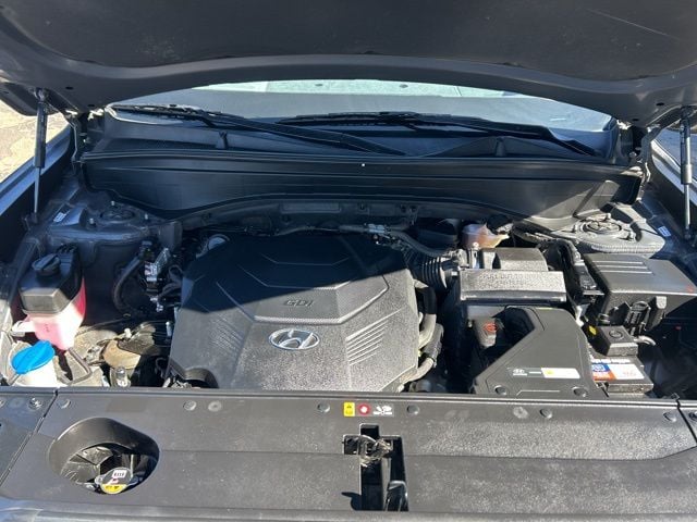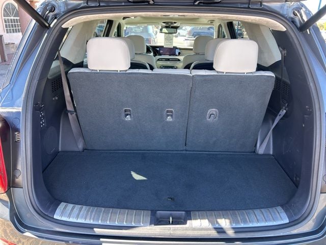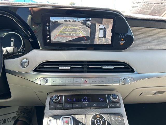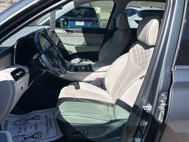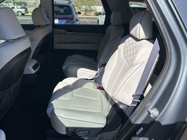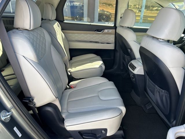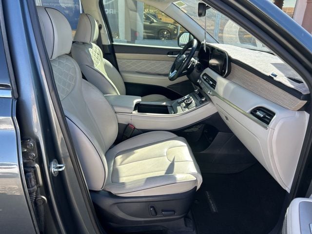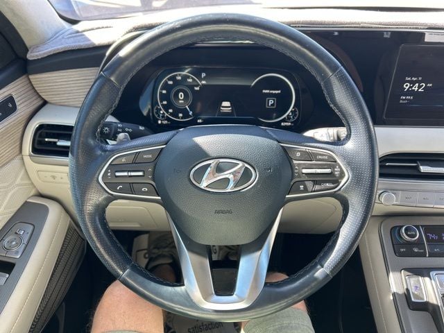 This 2022 Hyundai Palisade is equipped with the following options: Cargo Package (Cargo Block, Cargo Net, and Cargo Tray), Option Group 01, 12 Speakers, 3.648 Axle Ratio, 3rd row seats: split-bench, 4-Wheel Disc Brakes, ABS brakes, Air Conditioning, Alloy wheels, AMFM radio: SiriusXM, Apple CarPlay & Android Auto, Auto High-beam Headlights, Auto-dimming Rear-View mirror, Auto-leveling suspension, Automatic temperature control, Brake assist, Bumper Applique, Bumpers: body-color, Cargo CoverScreen, Carpeted Floor Mats, Compass, Delay-off headlights, Driver door bin, Driver vanity mirror, Dual front impact airbags, Dual front side impact airbags, Electronic Stability Control, Emergency communication system: Blue Link Connected Car Service (3-year complimentary subscription), First Aid Kit, Four wheel independent suspension, Front anti-roll bar, Front Bucket Seats, Front Center Armrest, Front dual zone AC, Front reading lights, Fully automatic headlights, Garage door transmitter: HomeLink, harmankardon?? Speakers, Heads-Up Display, Heated & Ventilated Front Bucket Seats, Heated door mirrors, Heated front seats, Heated rear seats, Heated steering wheel, Illuminated entry, Knee airbag, Low tire pressure warning, Memory seat, Navigation System, Occupant sensing airbag, Outside temperature display, Overhead airbag, Overhead console, Panic alarm, Passenger door bin, Passenger vanity mirror, Power door mirrors, Power driver seat, Power Liftgate, Power moonroof, Power passenger seat, Power steering, Power windows, Premium Nappa Leather Seat Trim, Radio data system, Radio: AMFMMP3 Premium Audio System, Rain sensing wipers, Rear air conditioning, Rear anti-roll bar, Rear audio controls, Rear reading lights, Rear window defroster, Rear window wiper, Reclining 3rd row seat, Remote keyless entry, Security system, Speed control, Speed-sensing steering, Split folding rear seat, Spoiler, Steering wheel mounted audio controls, Tachometer, Telescoping steering wheel, Tilt steering wheel, Traction control, Trip computer, Turn signal indicator mirrors, Variably intermittent wipers, Ventilated front seats, Ventilated rear seats, Wheel Locks, and Wh
