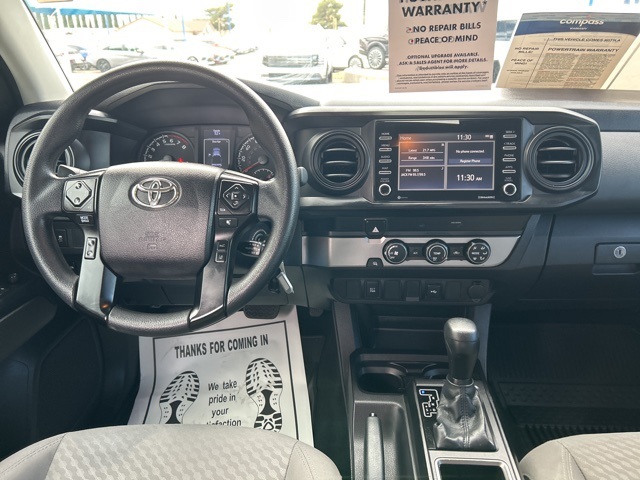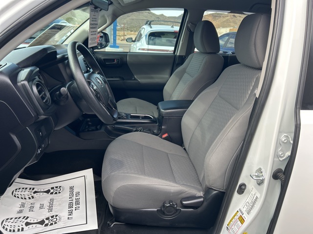 This 2022 Toyota Tacoma is equipped with the following options: 6 Speakers, ABS brakes, Air Conditioning, AMFM radio: SiriusXM, AMFM Stereo, Anti-whiplash front head restraints, Apple CarPlayAndroid Auto, Auto High-beam Headlights, Axle Ratio: 4.30, Brake assist, Bumpers: body-color, Driver door bin, Dual front impact airbags, Dual front side impact airbags, Electronic Stability Control, Emergency communication system: Safety Connect with 1-year trial, Exterior Parking Camera Rear, Fabric Seat Trim (FB), Front anti-roll bar, Front Bucket Seats, Front Center Armrest, Front reading lights, Front Seats, Front wheel independent suspension, Illuminated entry, Knee airbag, Low tire pressure warning, Occupant sensing airbag, Outside temperature display, Overhead airbag, Overhead console, Passenger door bin, Power door mirrors, Power steering, Power windows, Rear step bumper, Speed control, Speed-sensing steering, Split folding rear seat, Steering wheel mounted audio controls, Tachometer, Telescoping steering wheel, Tilt steering wheel, Traction control, Variably intermittent wipers, and Wheels: 16'' x 7J Style Steel Disc.