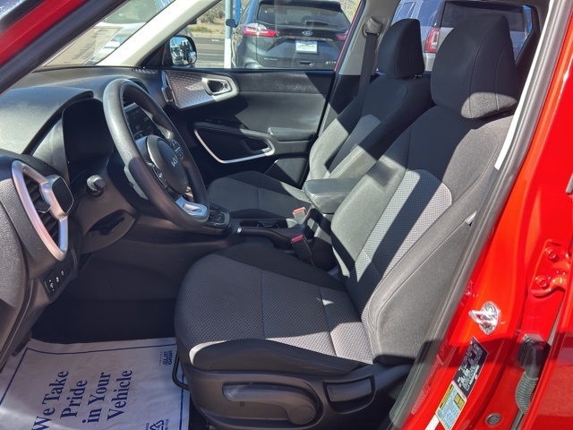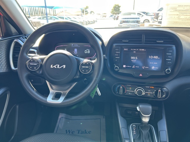 This 2023 Kia Soul is equipped with the following options: LX Technology Package (16'' Alloy Wheels, Blind-Spot Collision-Avoidance Assist, Lane Change Assist, and Rear Cross-Traffic Collision Avoidance Assist), 16'' Steel Wheels, 4-Wheel Disc Brakes, 6 Speakers, ABS brakes, Air Conditioning, AMFM radio, Apple CarPlay & Android Auto, Auto High-beam Headlights, Brake assist, Bumpers: body-color, Carpeted Floor Mats, Compass, Delay-off headlights, Driver door bin, Driver vanity mirror, Dual front impact airbags, Dual front side impact airbags, Electronic Stability Control, Exterior Parking Camera Rear, Front anti-roll bar, Front Bucket Seats, Front Center Armrest, Front reading lights, Front wheel independent suspension, Fully automatic headlights, Illuminated entry, Low tire pressure warning, Occupant sensing airbag, Outside temperature display, Overhead airbag, Overhead console, Panic alarm, Passenger door bin, Passenger vanity mirror, Power door mirrors, Power steering, Power windows, Radio data system, Radio: AMFMMP3HD Audio System, Rear Bumper Applique, Rear window defroster, Rear window wiper, Remote keyless entry, Speed control, Speed-sensing steering, Split folding rear seat, Steering wheel mounted audio controls, Tachometer, Telescoping steering wheel, Tilt steering wheel, Traction control, Trip computer, Variably intermittent wipers, and Woven & Tricot Cloth Seat Trim.