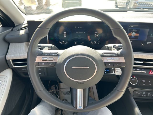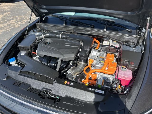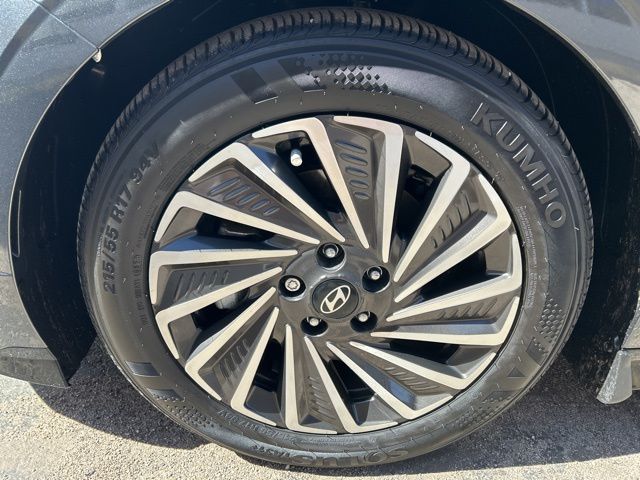 This 2024 Hyundai Sonata Hybrid is equipped with the following options: Option Group 01, I4, 17'' x 7.0J Aluminum Alloy Wheels, 4-Wheel Disc Brakes, 6 Speakers, ABS brakes, Air Conditioning, Alloy wheels, AMFM radio: SiriusXM, Apple CarPlay & Android Auto, Auto High-beam Headlights, Automatic temperature control, Brake assist, Bumpers: body-color, Cargo Tray, Carpeted Floor Mats, Delay-off headlights, Driver door bin, Driver vanity mirror, Dual front impact airbags, Dual front side impact airbags, Electronic Stability Control, Emergency communication system: Bluelink, Four wheel independent suspension, Front anti-roll bar, Front Bucket Seats, Front Center Armrest, Front dual zone AC, Front reading lights, Fully automatic headlights, Heated door mirrors, Heated Front Bucket Seats, Heated front seats, Illuminated entry, Knee airbag, Lane Departure Warning System, Leather steering wheel, Low tire pressure warning, Mud Guards, Occupant sensing airbag, Outside temperature display, Overhead airbag, Overhead console, Panic alarm, Passenger door bin, Passenger vanity mirror, Power door mirrors, Power driver seat, Power passenger seat, Power steering, Power windows, Premium Cloth Seating Surfaces, Radio data system, Radio: AMFMHDSiriusXM, Rear anti-roll bar, Rear seat center armrest, Rear side impact airbag, Rear window defroster, Remote keyless entry, Security system, Speed control, Speed-sensing steering, Speed-Sensitive Wipers, Split folding rear seat, Spoiler, Steering wheel mounted audio controls, Tachometer, Telescoping steering wheel, Tilt steering wheel, Traction control, Trip computer, Trunk Cargo Net, Variably intermittent wipers, and Wheel Locks.