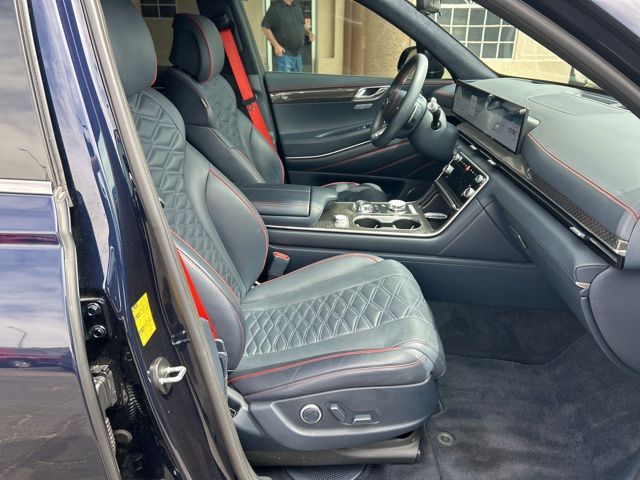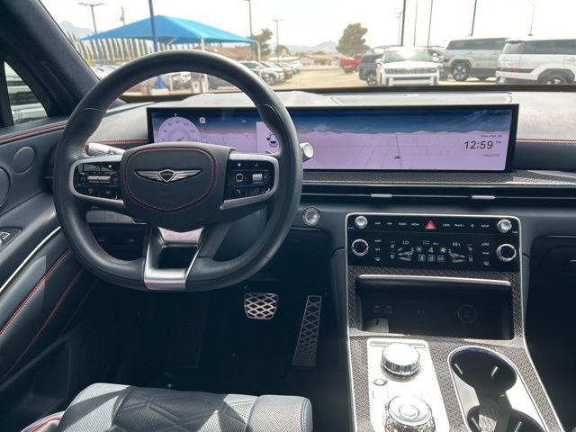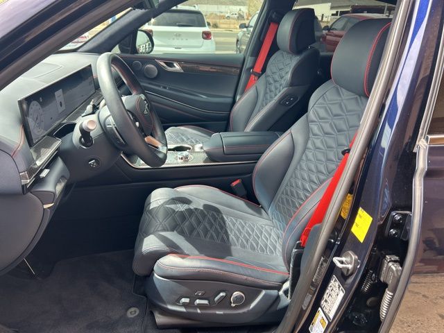 This 2025 Genesis GV80 Coupe is equipped with the following options: Option Group 01, 18 Speakers, 4-Wheel Disc Brakes, ABS brakes, Adaptive suspension, Air Conditioning, Alloy wheels, AMFM radio: SiriusXM, Android Auto & Apple CarPlay, Anti-whiplash front head restraints, Auto High-beam Headlights, Auto tilt-away steering wheel, Auto-dimming door mirrors, Auto-dimming Rear-View mirror, Automatic temperature control, Brake assist, Bumpers: body-color, Compass, Delay-off headlights, Driver door bin, Driver vanity mirror, Dual front impact airbags, Dual front side impact airbags, Electronic Stability Control, Emergency communication system: Genesis Connected Services, Exterior Parking Camera Rear, Four wheel independent suspension, Front anti-roll bar, Front Bucket Seats, Front Center Armrest, Front dual zone AC, Front reading lights, Fully automatic headlights, Garage door transmitter: HomeLink, Heads-Up Display, Heated and Ventilated Front Bucket Seats, Heated door mirrors, Heated front seats, Heated rear seats, Heated steering wheel, Illuminated entry, Knee airbag, Low tire pressure warning, Memory seat, Nappa Leather Seating Surfaces, Navigation System, Occupant sensing airbag, Outside temperature display, Overhead airbag, Overhead console, Panic alarm, Passenger door bin, Passenger vanity mirror, Power door mirrors, Power driver seat, Power Liftgate, Power moonroof, Power passenger seat, Power steering, Power windows, Radio data system, Radio: AMFMHD Bang & Olufsen Premium Audio, Rain sensing wipers, Rear air conditioning, Rear anti-roll bar, Rear reading lights, Rear seat center armrest, Rear side impact airbag, Rear window defroster, Remote keyless entry, Security system, Speed control, Speed-sensing steering, Speed-Sensitive Wipers, Split folding rear seat, Spoiler, Sport steering wheel, Steering wheel memory, Steering wheel mounted audio controls, Tachometer, Telescoping steering wheel, Tilt steering wheel, Traction control, Trip computer, Turn signal indicator mirrors, Variably intermittent wipers, Ventilated front seats, Ventilated rear seats, and Wheels: 22'' Dark Gray Matte Sport Alloy.